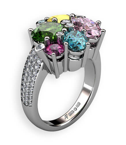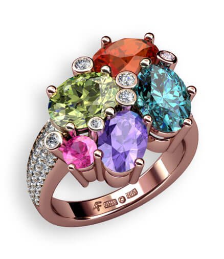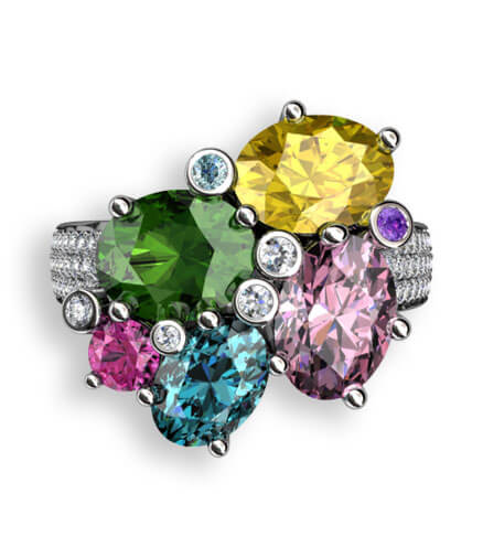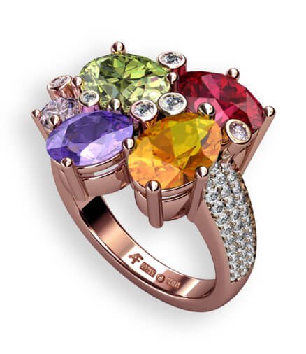 Här har ni möjlighet att plocka ihop Er egen läckra ”godispåse” med färgstenar av olika de slag. Modellen går att få med pavéinfattade briljantslipade diamanter på ringens sidor alternativt utan dessa. Ringen är formgiven av Anders Fors och vi tillverkar den i vitguld, roséguld, rött guld och platina. Candy är en serie ringar där Ni kan vara med och påverka utseendet genom önskemål på ädelstenarnas färg och form.