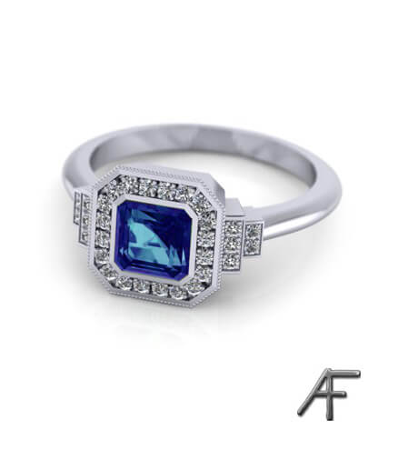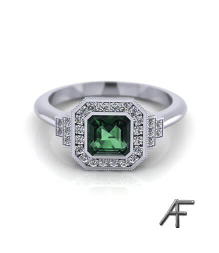 Art Deco – är en haloring som vi tillverkat i platina med grön safir eller blå safir som centersten. Modellen går även att få med diamant som centersten och i 18 k rött guld eller roséguld.