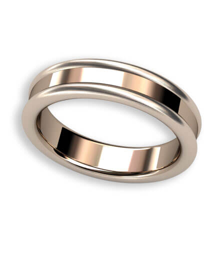 Inspirationen till denna ring är tvåsamheten där de mjuka kanterna på vardera sida symboliserar just denna förening mellan två personer. Ringarna på bilden har en bredd av ca 4,5 mm och en höjd av ca 1,9 mm, men går att få i andra mått också. Bilderna visar ringen utförd i 18 k rött och vitt guld, blank, sidenmatt och blank. Modellen går även att få i roséguld och i Platina.